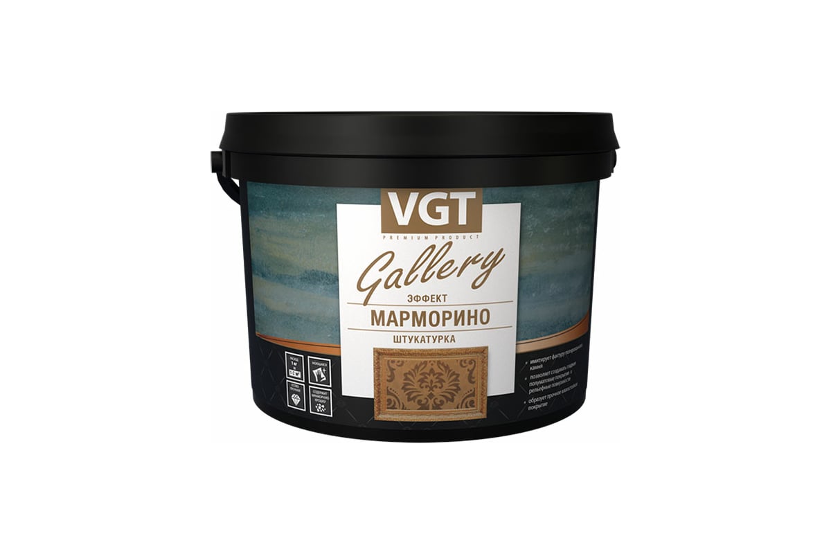 Декоративная штукатурка VGT эффект Марморино 2.5 л, 4.5 кг 11607740 - это декоративный материал для создания покрытий с различной структурой и рисунком: от гладких поверхностей с легким глянцем в стиле "венецианской штукатурки", имитирующих фактуру полированного камня или мрамора до получения рельефных покрытий с разным уровнем блеска.