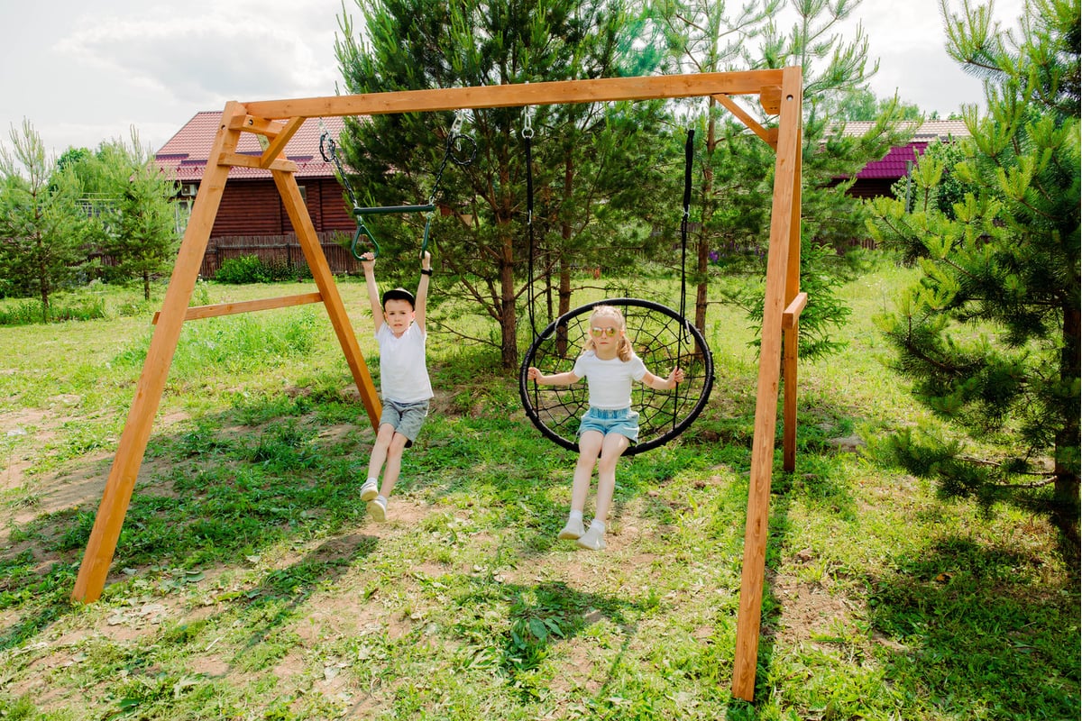 Игровые качели с легкостью устанавливаются на любой свободной от насаждений ровной территории.
