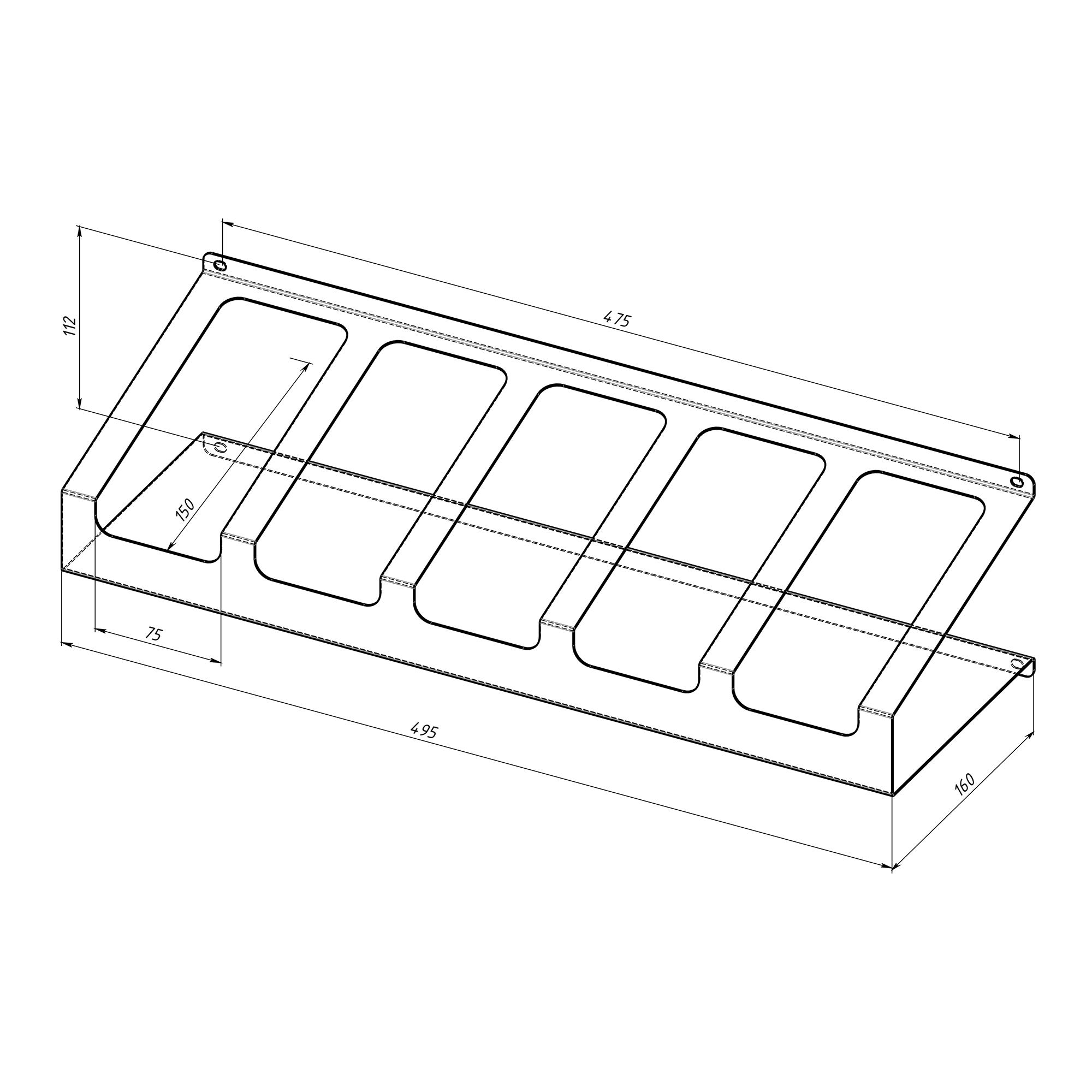 (Д × Ш × В): 495х160х124мм и пять посадочных мест шириной 75мм и глубиной 150мм (для канистр объемом 1 литр), благодаря которым данное изделие станет вашим незаменимым помощником для размещения и хранения масел и жидкостей разных типов: моторное масло, трансмиссионное масло; охлаждающая жидкость; жидкость для гидроусилителя руля; жидкость для омывателя лобового стекла; фреон; тосол; незамерзайка; аэрозольная краска; акриловая эмаль; Аэрозольный клей; WD-40 и многое другое обретут свое место для хранения.