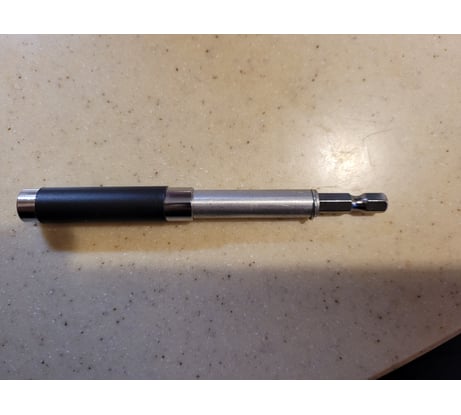 Очень удобный магнитный держатель для фиксации бит. С его помощью можно упростить процесс сборки и крепления заготовок. Достаточно приложить винт или саморез к бите и сразу создается соединение фиксирующее и ориентирующее метиз в пространстве. Это удобно, когда надо провести сборку в глубоком отверстии . Кроме того при разборке изделий с мелким крепежом магнит позволяет его зафиксировать и сохранить на рабочем столе