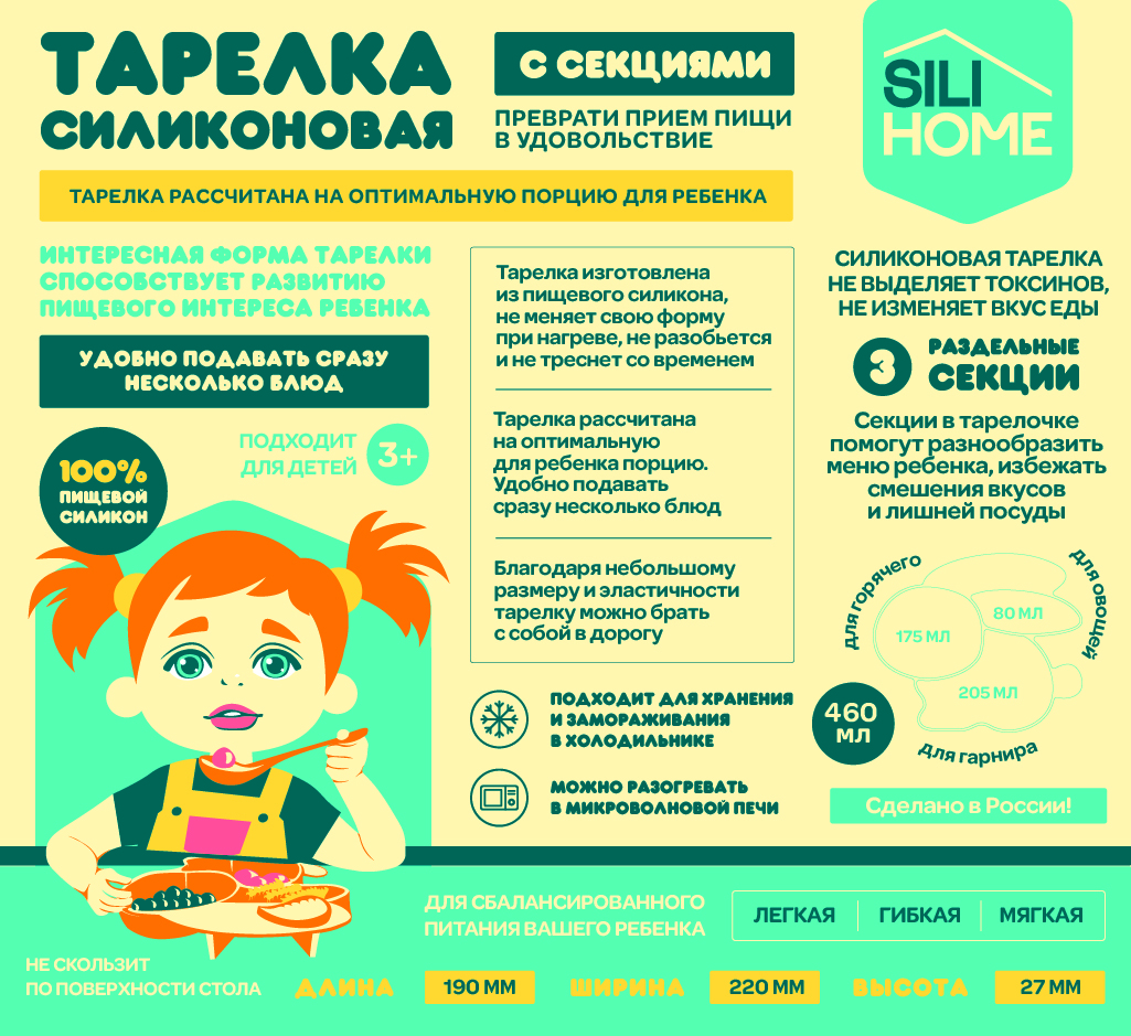 Тарелка изготовлена из пищевого силикона, не меняет свою форму при нагреве, не разобьется и не треснет со временем.