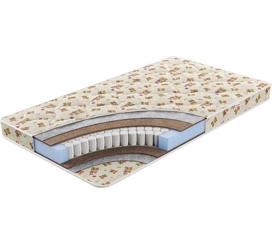 Модель Kinni Olaf - анатомический детский матрас от бренда Sontelle. У матраса Kinni Olaf расположен блок независимых пружин. Тип пружинного блока TFK представляет собой 512 цилиндрических пружин на спальное место (256 на кв.м). Изделия с пружинным блоком TFK подойдут парам, в которых разница в весе партнеров не превышает 20 кг, и людям с весом до 100 кг. В модели Kinni Olaf количество пружин на спальное место составляет 500 шт. Нагрузка на спальное место составляет 110 кг. Высота модели составляет 12 см. В данной модели используются следующие материалы: Поликоттон Kid Dream, Войлок, Кокос, ПБ TFK, Кокос, Войлок, Поликоттон Kid Dream. Кокосовая койра - натуральный износостойкий материал, отличающийся высокой жесткостью и упругостью. Войлок - плотный прокладочный материал из натуральных и искусственных волокон, который часто используется в пружинных моделях для защиты материалов наполнителей и чехла изделия. Чехол в модели Kinni Olaf изготовлен из материала Поликоттон. Поликоттон – современная комбинированная ткань, состоящая из синтетических и натуральных хлопковых волокон. Отличительные особенности ткани: пористость, способность пропускать влагу и воздух, гипоаллергенность и экологичность. Модель Kinni Olaf имеет 2 одинаковые стороны жесткости. Степень жесткости модели Kinni Olaf с обеих сторон: Средне-жесткий. Гарантийный срок составляет 1.5 года. Срок службы составляет 10 лет.