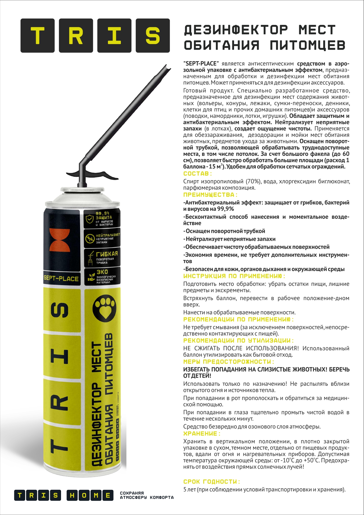 "SEPT-PLACE" является антисептическим средством в аэрозольной упаковке с антибактериальным эффектом, предназначенным для обработки и дезинфекции мест обитания питомцев. Может применяться для дезинфекции аксессуаров.