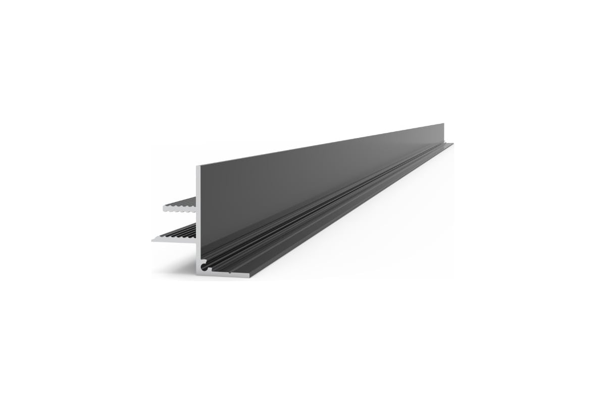 Плинтус потолочный под гипсокартон 10 мм изготовлен из анодированного алюминиевого сплава и имеет черное матовое покрытие. Благодаря улучшенным характеристикам плинтуса, монтаж будет несложным, а результат превысит ваши ожидания. На основании плинтуса предусмотрены насечки для крепления его стене с помощью саморезов. Две рифленые планки под основанием плинтуса обеспечивают лучшее сцепление с гипсокартоном и шпаклевкой, что исключает дальнейшее появление трещин на потолке. Специальный технологический зазор в плинтусе позволяет без труда стыковать два профиля между собой с помощью финишного гвоздя. Саморезы и финишные гвозди приобретаются отдельно.