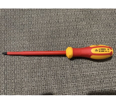 Диэлектрическая отвёртка предназначена для ремонтных работ в условиях наличия напряжения до 1000 В. Изготовлена из сверхпрочной стали, что делает инструмент надежным и долговечным. Наконечник покрыт чёрной оксидной плёнкой. Эргономичная рукоять служит для комфортной эксплуатации.