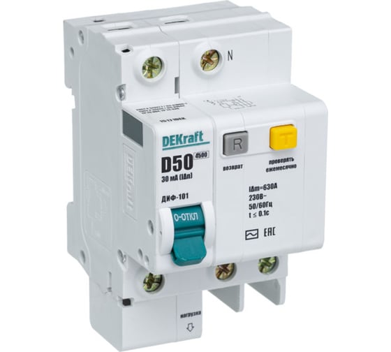 Автоматический выключатель дифференциального тока (АВДТ) DEKraft ДИФ-101, 1 Р+N, 50 А, 30 мА, хар-ка D, 4.5 кА 15171DEK