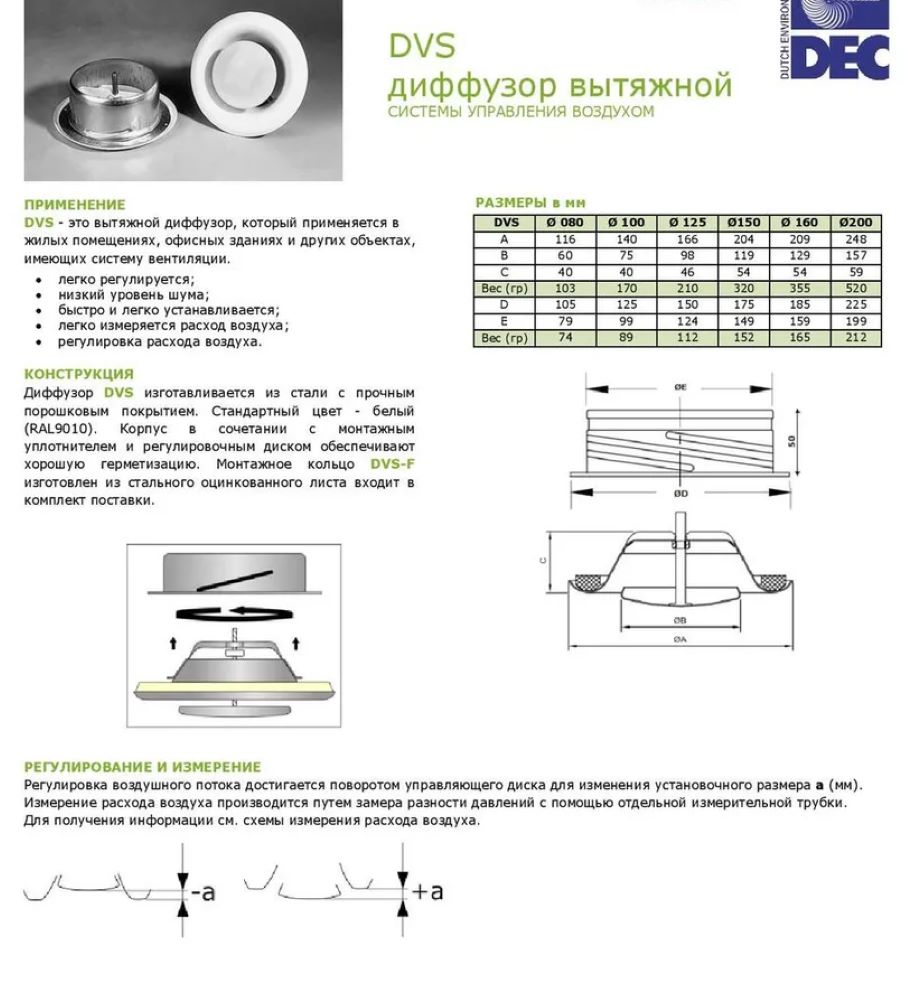 Приточные черные диффузоры серии DVS-P серии REGA представляют собой дисковый клапан круглого сечения с конусом аэродинамической формы. Новинка 2022 года от официального представителя голландской компании Dec International в России.В комплекте монтажное кольцо. Отличные характеристики по уровню шума, падению давления и пропускной способности воздуха. Предназначен для потолочного монтажа. Диффузор изготовлен из оцинкованной стали с порошковым покрытием для обеспечения высокого качества поверхности и хорошего качества, а также устойчивого к ударам и царапинам. Также корпус снабжен прокладкой из пористого поролона, образующее герметичное уплотнение. Подходит для помещений с высокой влажностью воздуха (например, кухня, ванная). Возможна регулировка расхода воздуха. Конус выкручивается на количество оборотов, необходимое для обеспечения нужного сечения в мм, соответствующего перепаду давления и желаемому расходу воздуха согласно графику. Падение давления проверяется путем введения подходящего измерительного щупа спереди за конусом клапана. Технические характеристики Применение: распределение приточного воздуха; общеобменная вентиляция; в системах кондиционирования воздуха. Описание: потолочный монтаж; Конструкция: материал корпуса: сталь; защита: порошковое напыление; уплотнение: поролон; крепление: монтажное кольцо; регулировка расхода воздуха.