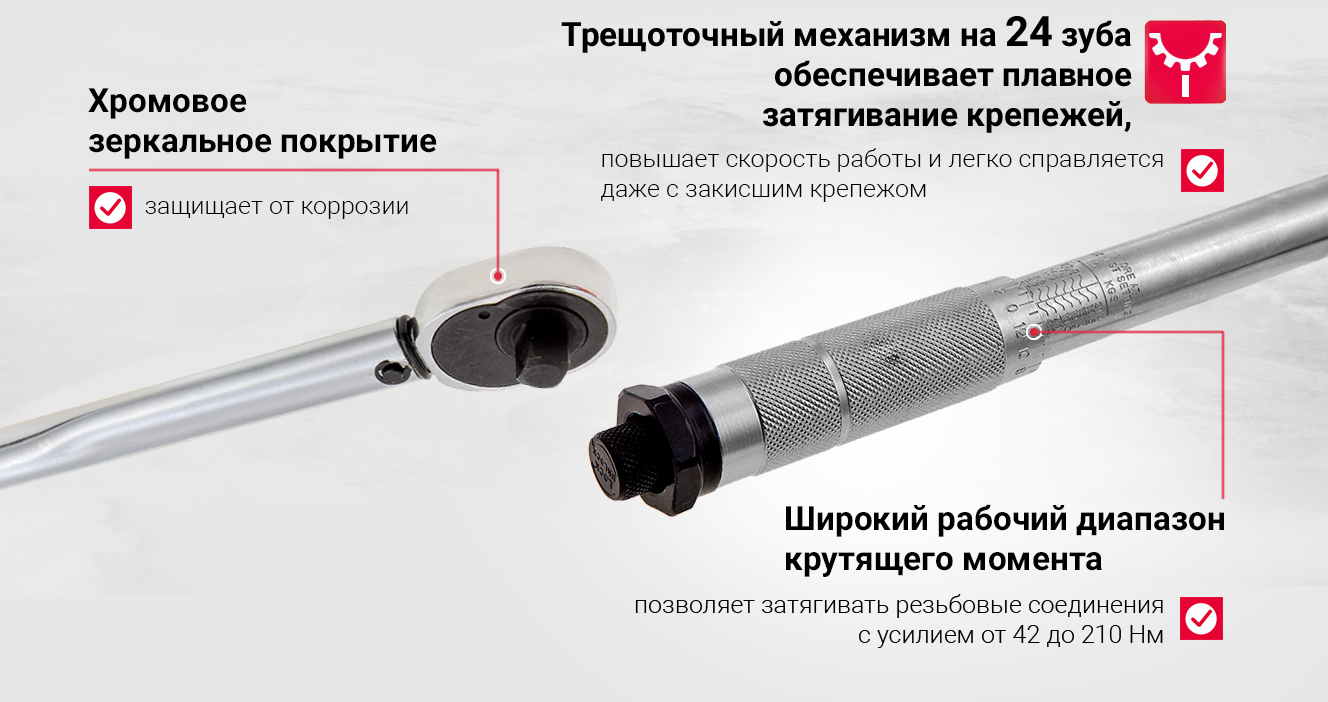 Рекомендую трещотку разобрать и смазать. Смазки там нет, вообще сухо. Если пользоваться аккуратно, то ключ, за эту сумму, хороший. Работает и на моменте 28 Н/м и на 210 Н/м. Главное тянуть без перекосов (параллельно плоскости) и до первого щелчка. Щелкает слышно и по руке отчетливо передается щелчок.