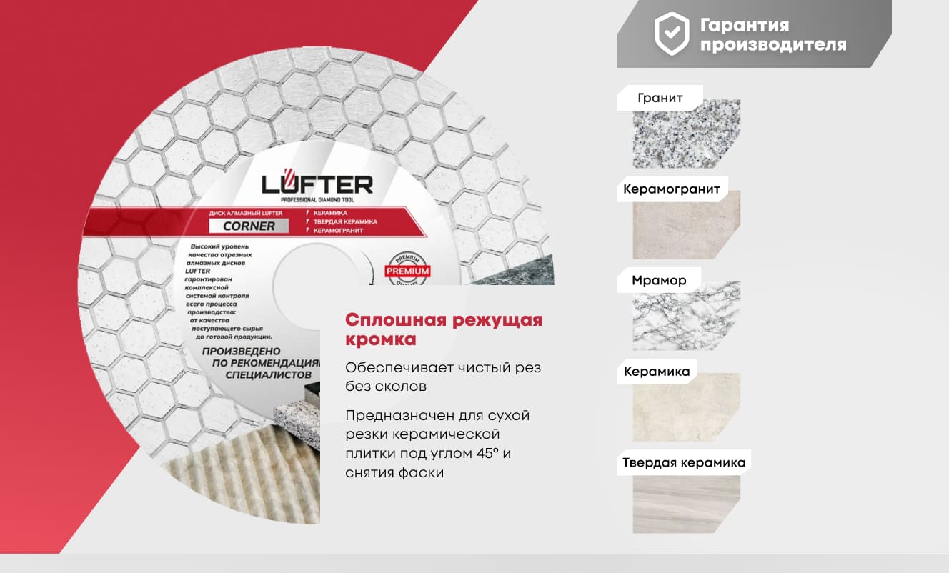 LUFTER CORNER 125 мм СПЛОШНОЙ - это универсальный алмазный диск, предназначен для сухой резки керамической плитки под 45 градусов ("заусовка плитки"), снятия фаски.