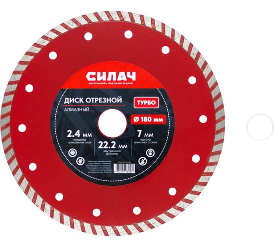 Диск алмазный отрезной СИЛАЧ 180х22.2 мм, ТУРБО, по бетону, кирпичу, камню, граниту 025768