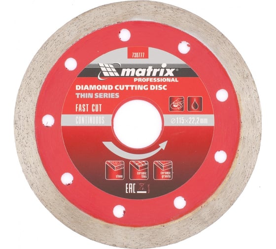 Отрезной сплошной алмазный диск Matrix ф115х22,2 мм 730777, тонкий, обеспечивает мокрое резание плотных материалов: керамогранита, керамической и кафельной плитки, мрамора, натурального и искусственного камня. Он устанавливается на УШМ или плиткорезы и используется с применением водяного охлаждения. Диск увеличивает производительность на 20% благодаря небольшой толщине 1,4 мм и снижению нагрузки на инструмент.