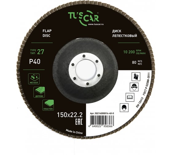 Диск лепестковый торцевой TUSCAR 150х22.2-T27, P 40, универсальный (10 штук) 50214000014-40-0