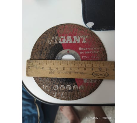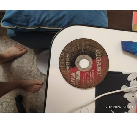 Забирал товар из ПВЗ ,,ВИ,, ,вспомнил, что давно собирался убрать на балконе железяку с перекладинами, ведущую на верхний этаж и надо прикупить кругов для этой затеи. На выбор были луганские и эти. С лугой опыт работы есть- пилит быстро, но при заглублении в метал быстро снашивается. Бошевские круги пилят помедленнее, но и износ при заглублении не такой быстрый. Гигантовские круги были поблескучей чем луга( как бошевские), взял их, с запасом, 4 штуки( предстояло срезать угольник 50*50*5 в четырех местах, а потом срезать с них 8 поперечных арматурин диаметром 16 мм ). Режет медленнее чем луга, но не крошится по краю при подкусывании. Хым-м-м, хватило одного круга, ещё и осталось. Фото круга после окончания работ.