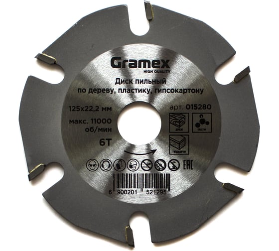 Диск пильный для УШМ SpeedCutter 125x22.2 мм, 6T, по дереву, пластику, гипсокартону Gramex 015280