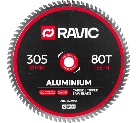 Диск пильный по алюминию, отрицательный угол Ravic, 305x3,2/2,5x25,4 мм, Z=80, арт. 212.0305 предназначен для точного реза алюминия, а также других цветных металлов. Данный диск обладает оптимальными характеристиками для чистой резки материалов без заусенцев и повреждений поверхности. Диаметр диска — 305 мм, посадочное отверстие — 25,4 мм, число зубьев — 80 шт, ширина пропила / толщина корпуса — 3,2/2,5 мм.