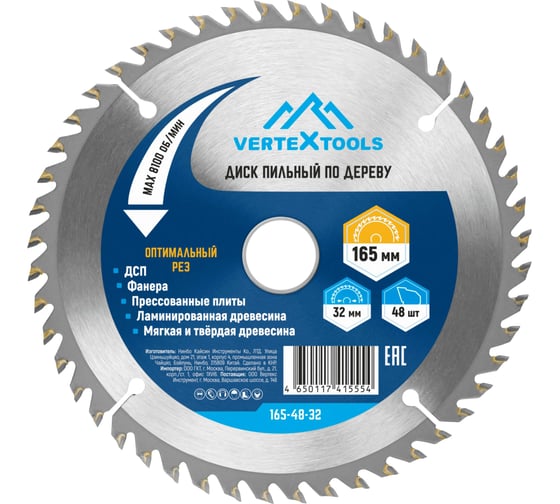 Технические характеристики пильного диска по дереву vertextools 165-48-32
