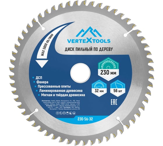 Технические характеристики пильного диска по дереву vertextools 230-56-32