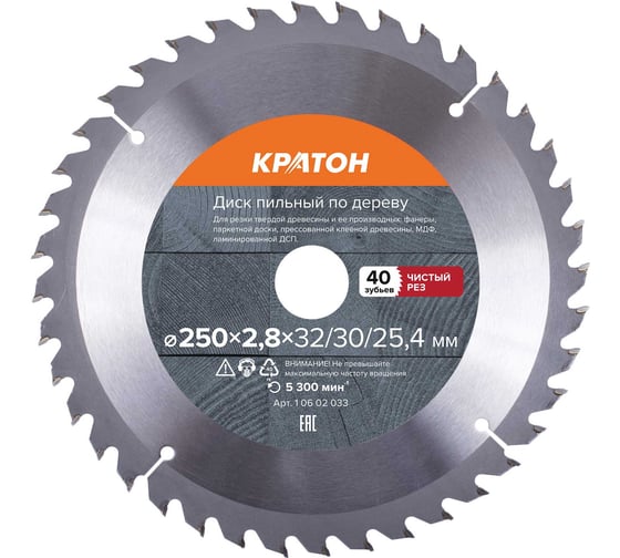 1. Диск пильный по дереву, чистый рез Кратон ø250 х 32/30 х 2,9 мм, 40 Т