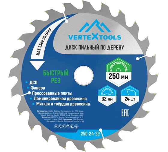 Технические характеристики пильного диска по дереву vertextools 250-24-32