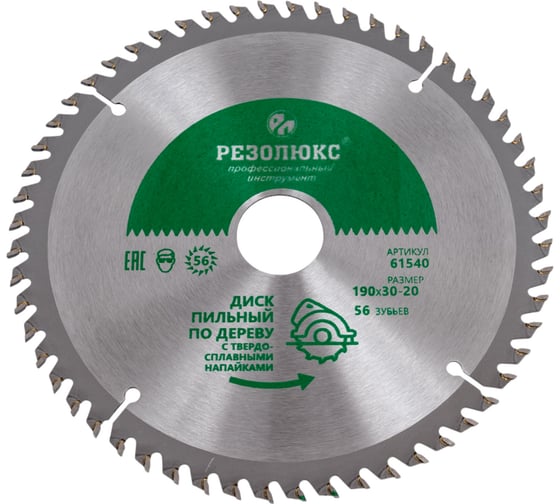 Пила дисковая по дереву с твердосплавными пластинами (190x20-30 мм; 56Т) РЕЗОЛЮКС 61540 предназначена для ручных циркулярных пил и лёгких станков.