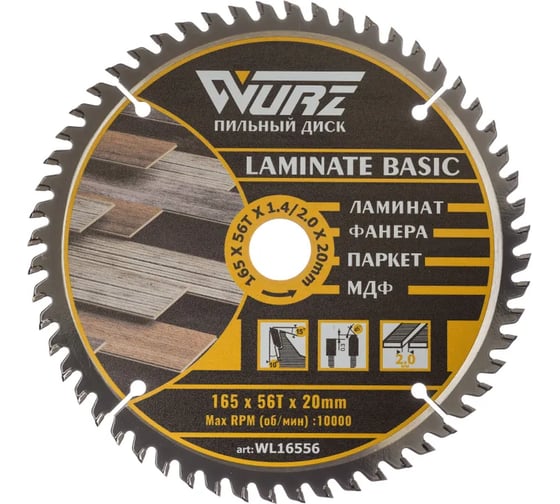 Диск пильный по ламинату 165х56Тх1.4/2.0х20мм WURZ WL16556