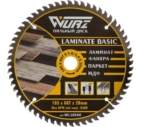 Диск пильный по ламинату 185х60Тх1.6/2.4х20мм WURZ WL18560