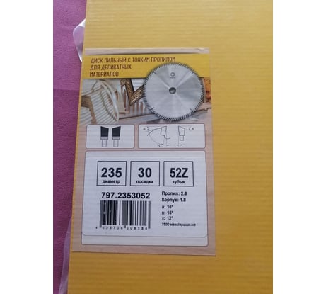 Столярный финишный диск по дереву. И только по дереву. Заточка и форма зубьев ATB исключает долгую работу по ламинату, зачем тут пишут про ламинат мне не понятно. Далее, диск исключительно для ручной или настольной циркулярки. Для торцовки не рекомендуется ибо угол заточки положительный. Диск уровня ДеВолт Экстреме фор Вуд или Бош такого же класса, но с щадящей ценой. Для меня такой тип размер диска особенно актуален ибо сделал самодельную настольную циркулярку из ручной пилы на 235 и оказалось что приличных дисков на такой тип размер очень трудно найти за разумные деньги. Я и это взял когда была хорошая скидка и то уровень цены дисков СМТ. Однако СМТ, я их купил первоначально, на 24 и на 48 зубьев, меня разочаровали и если на 24 для распила вдоль по умолчанию рез так себе и требует дальнейшей обработки, то 48 поставил меня в тупик своим качеством, точнее отсутствием. Это все что угодно только не файн финиш. Про их китайские копии под именем вудворк даже говорить не хочу. Прокут оказался именно тем чем и заявлен Файн финиш. Чему я крайне рад, ибо специализированные диски от Деволт или Бош стоят как крыло Боинга. Да, пусть вас не смущает наклейка с российским штрих кодом - санкции однако ... Да, балансировка и геометрия идеальна, проверил сначала в пвз на плитке, потом дома на стекле и собсно в пиле.