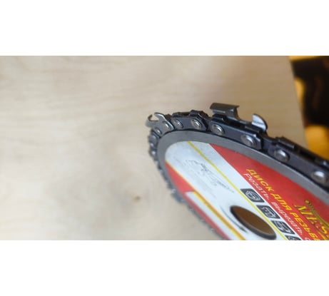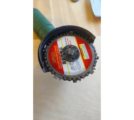 Диск цепной MESSER для работ по дереву имеет самый универсальный диаметр для угловых шлифовальных машин - 125 мм. Такой диаметр позволяет погружать диск глубже в древесину, чем если бы он был 115 мм., соответственно полезная глубина пропила составляет около 40 мм. Таким образом позволяет с запасом хода перепиливать дюймовую доску. Диск сделан из нержавеющей стали, по конструкции напоминает шину цепной пилы, имеются пазы в которых расположена кольцевая пильная цепь, за исключением того, что снять её не получится не расклепав. Так как, кольцевая пильная цепь своей нижней частью находится в специальных пазах диска, это придаёт ей фиксацию на диске при этом она ещё сильно натянута. Диск из нержавеющей стали обладает хорошими прочностными характеристиками, справляется с повышенными нагрузками, что придаёт уверенности и чувство безопасности. Пильная цепь хорошего качества, отличается немного от привычной для меня формы, на режущих звеньях присутствует выбитая маркировка XWS, применима для сложных задач. Пильная цепь хорошо держит заточку при пилении чистой древесины, но бывают такие случаи, что надо что-нибудь пильнуть загрязнённое землёй или песком, вот здесь и появляется главное преимущество данного диска, что его не жалко затупить, так как круглым напильником можно быстро подправить заточку режущих звеньев и снова использовать для своих задач не теряя качества реза. Диск цепной легко-плавно погружается в древесину, по скорости получается быстро и ровно, качество реза хорошее. Прикрепил видео, как говорится: лучше один раз увидеть!