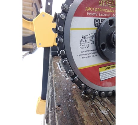 Раньше пользовался диском типа MESSER 10-40-333, не особо обращал внимания на такой с цепью, думал будет драть сильно. Решил взять попробовать на откосных рамах, попилить их. И каково было мое впечатление, когда первый раз им вопспользовался. Это лучшее изобретение для распила не только бревен, реек, и т.п. сооружений, но и идеально подойдёт для листов OSB. Пилил аккумуляторной УШМ (около 9000), в ней нет такой мощи и оборотов как на сетевой (11-12000), но пилит достаточно ровно и быстро, вгрызается и ведет вперед. Нужно уверенно держать ушм, чтобы не отлетела по инерции никуда.