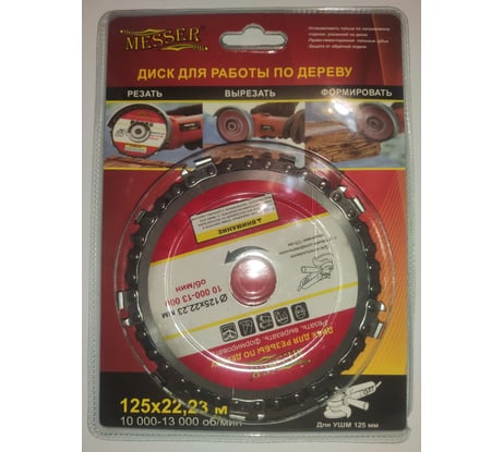 Диск цепной 125x22.23 мм для работ по дереву MESSER 10-40-334 предназначен для резки твердой древесины и пластика. Идеально подходит для резьбы, скульптуры, удаления небольших пней.