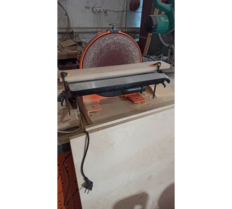 Отличный инструмент! Мне нравится! Очень тихий, массивный, основательный! Биение у рабочего диска (в моем случае) отсутствует, установил зазор между столом и абразивом 1 мм👍 (мне так нужно)! Стол выставил естественно по угольнику, заводскими метками не руководствовался, но они близки по смыслу)) Сначала была вибрация при работе, заметил, что абразив в диаметре на 2 мм больше и наклеен не по центру. Обрезал лишнее ножом и вибрация стала минимальной! (Видео снято до обрезки) Абразив наклеен зернистость примерно 60. Сам вращаюшийся диск очень массивный, выполнен из стали (не алюминий), имеет высокую инерцию, это хорошо! Центр вращения диска выше стола на примерно 10 мм. при угле стола 90 гр. Изучая фото товара думал, что двигатель имеет оребрение, которое спрятано под кожух - нет, оребрение только на переднем флаце, то что видим! Из патрубка для пылесоса дует при работе и выдувает абразив)). Взял этот, а не гриндер, потому что гриндер слишком сложный, много деталей, подшипники, которые быстро перегреваются, сохнут и дохнут)), шумный из за тех же подшипников! В целом, я доволен))