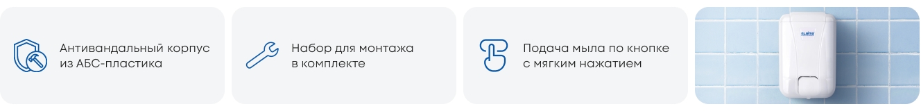 Антивандальный корпус выполнен из ударопрочного пластика ABS. Выдача мыла осуществляется экономичными порциями. Дозатор сочетается с расходными материалами других производителей. В комплект входят крепежные материалы.