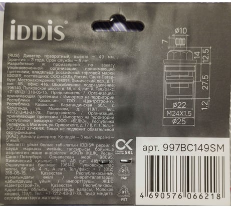 Дивертор для смесителя IDDIS латунь, керамика, 49 мм, поворотный 997BC149SM