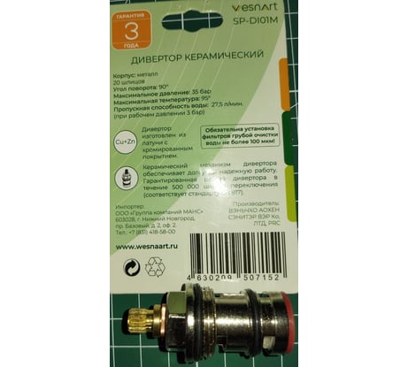 Дивертор Wesnaart SP-DI01M прекрасно подошёл для однорычажного смесителя Ganzer для ванной. Характеристики: Угол поворота: 90 градусов. Количество шлицев для крепления рукоятки: 20. Диаметр шлицевого соединения: 7,52 мм. Общая длина: 50,8 мм. Диаметр резьбы: 21,5 мм. Длина рабочей части: 30,4 мм Диаметр рабочей части: 19,6 мм. Размер под ключ: 17,2 мм. Дополнительная информация на фото.