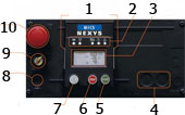 Устройство управления Nexys Позволяет работать в ручном и автоматическом режиме. На панели располагаются следующие элементы: 1) Подсветка; 2) Светодиоды аварийно-предупредительной индикации; 3) ЖК дисплей; 4) Место для дополнительных устройств (опции); 5) Кнопка запуска; 6) Кнопка останова; 7) Кнопка прокрутки меню; 8) Предохранитель; 9) Ключ питания On/Off; 10) Кнопка экстренного останова. |