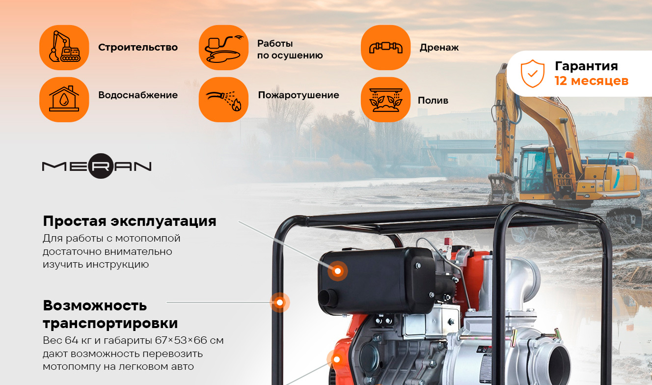 Мотопомпы MERAN являются надежным профессиональным оборудование и обеспечивают длительную и безотказную работу. Они успешно справляются с перекачкой воды различной степени загрязнения, что подтверждает их высокое качество. Область применения: дренаж, водоснабжение, пожаротушение, полив, осушение болот и котлованов. Коммунальные службы и строители, которые зачастую работают в условиях отсутствия электричества, с успехом используют их для своих нужд.