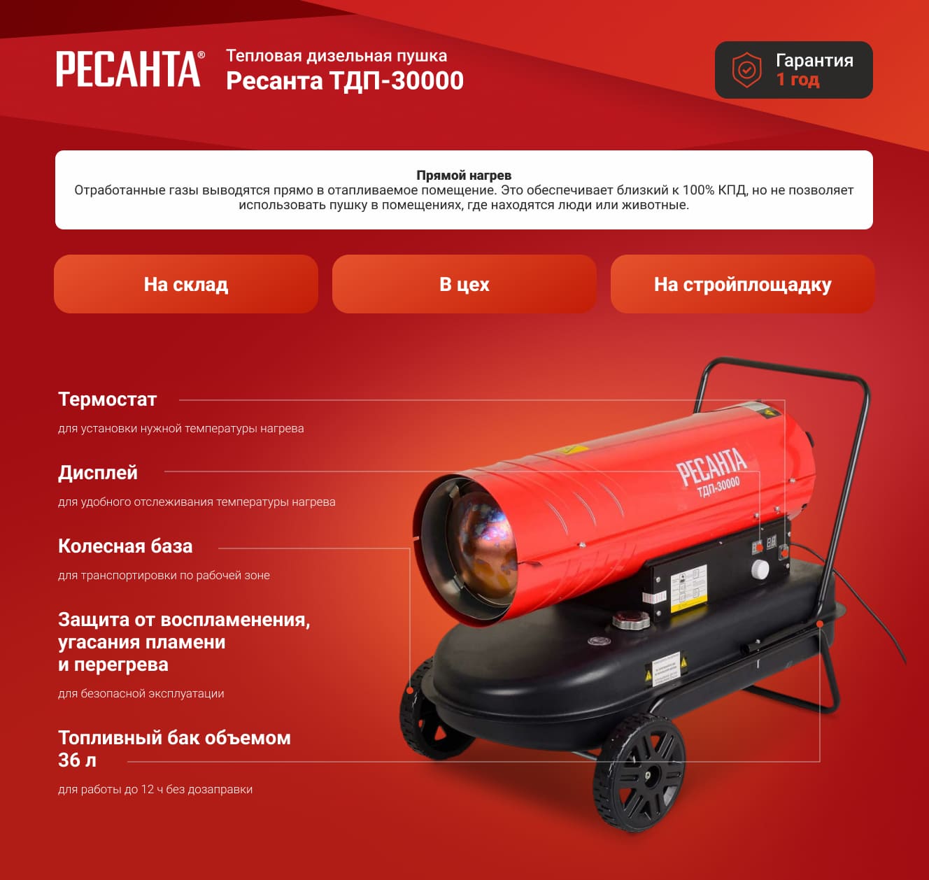 Тепловая пушка Ресанта ТДП-30000 поможет быстро обогреть гараж, складское или любое другое нежилое помещение. Мобильность устройства позволяет перемещать ее по объекту.