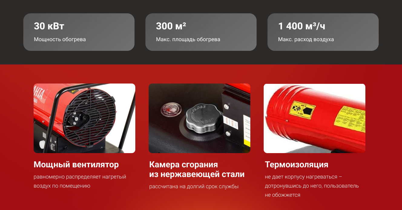 Высокая мощность нагрева: Позволяет быстро и эффективно обогревать большие помещения, обеспечивает комфортные условия для работы. Умеренный расход топлива: Экономит деньги, снижает эксплуатационные расходы.