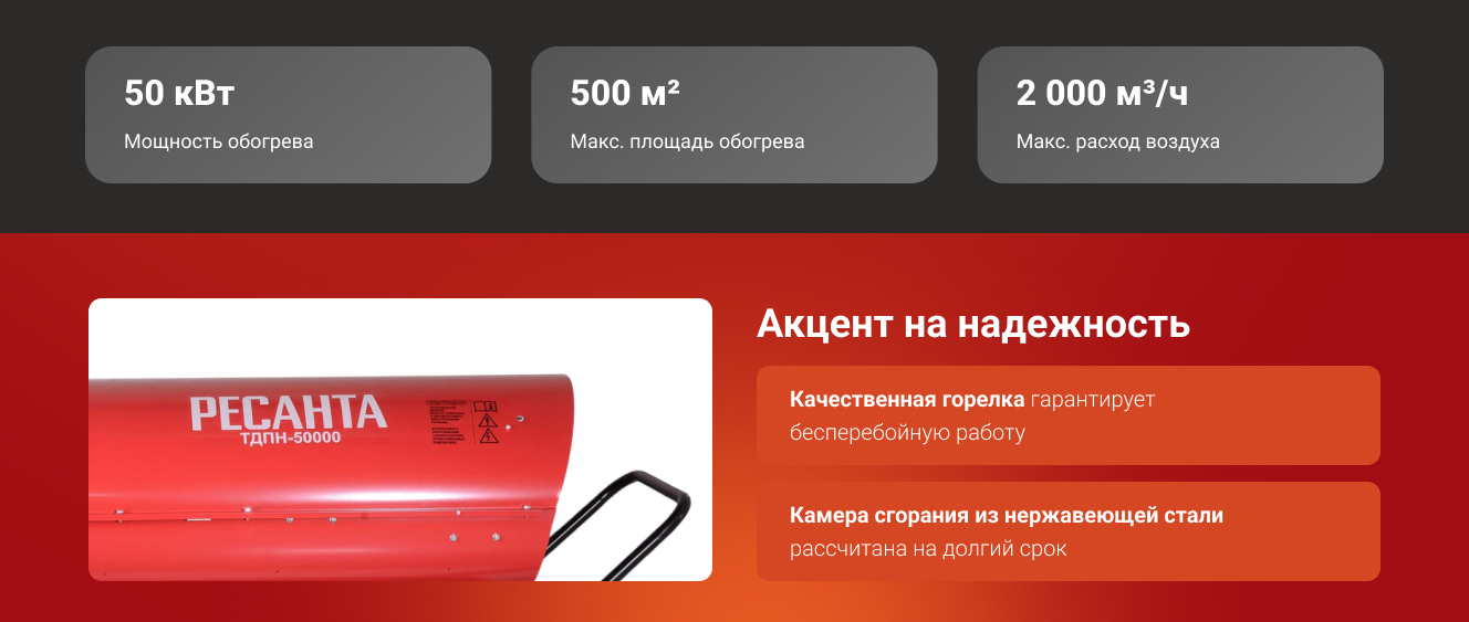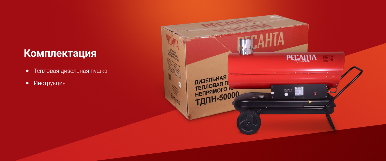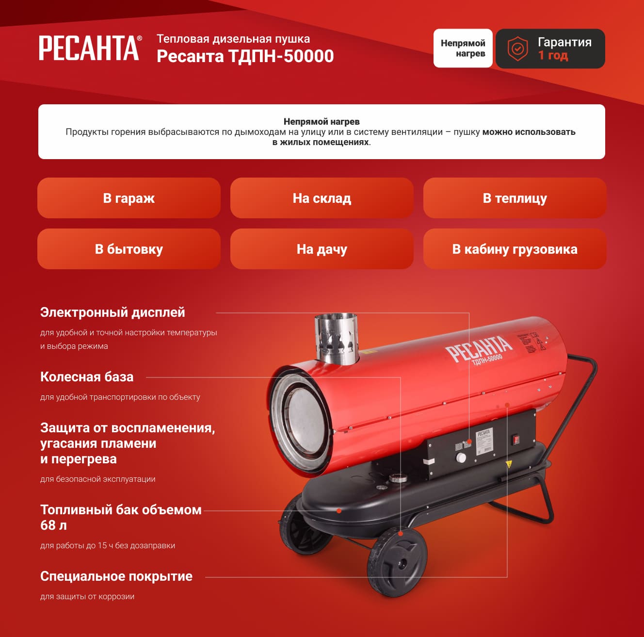 Дизельная тепловая пушка получила несколько систем защиты, обеспечивающих её стабильную безопасную и безаварийную работу. В конструкции прибора предусмотрен терморегулятор. Вес модели Ресанта ТДПН-50000 составляет 57.8 кг, но при этом она достаточно мобильная благодаря наличию рамы и колёс. Эта модель дизельной тепловой пушки может использоваться для обогрева любых помещений и не требует получения специальной разрешительной документации на её эксплуатацию.