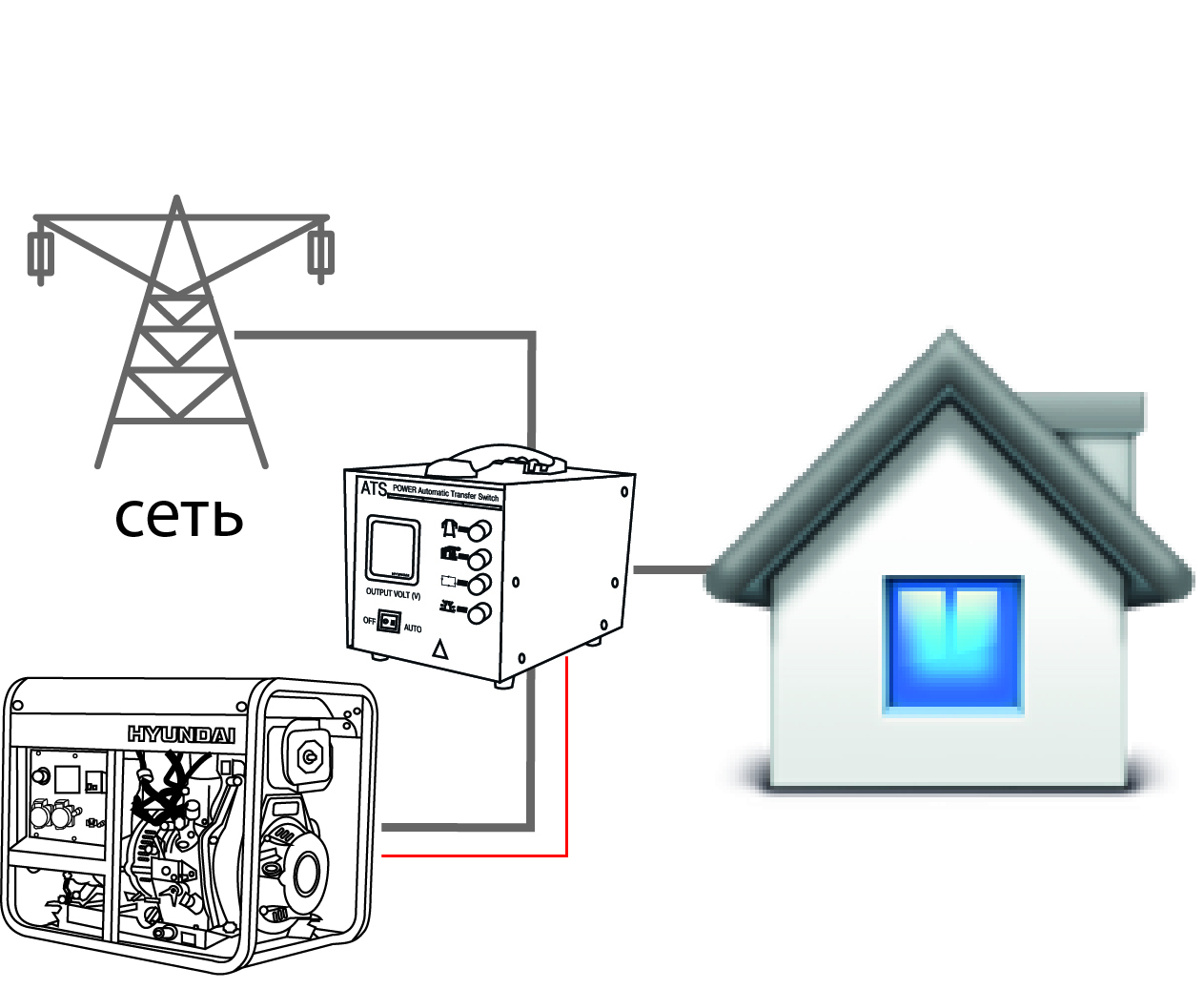 Автоматический запуск Встроенная система автоматического запуска дает возможность контролировать включение-выключение генератора в автоматическом режиме. Данная система компенсирует недостаток электричества при его отключении/включении. |