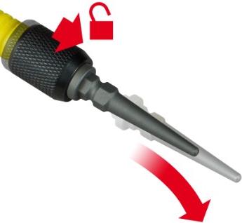 Функциональность Прилагаемый переставной наконечник легко извлекается, что обеспечивает возможность использования отверточных вставок с шестигранным хвостовиком 1/4". |