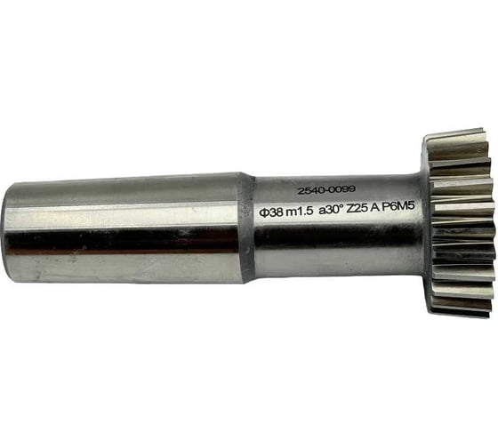 Купить долбяк хвостовой косозубый M1.5 z=25 30° D37.5. Цельный зуборезный инструмент для нарезания винтовых зубьев. Модуль 1.5 мм, угол наклона профиля 30 градусов. Посадочный диаметр хвостовика 37.5 мм. Для зубодолбежных станков с возможностью поворота суппорта или стола. Применяется в тяжелом машиностроении, редукторостроении, ремонте спецтехники и насосных агрегатов.