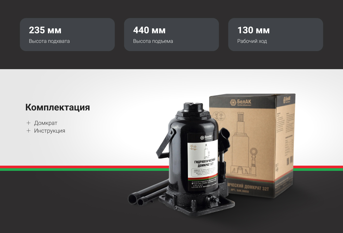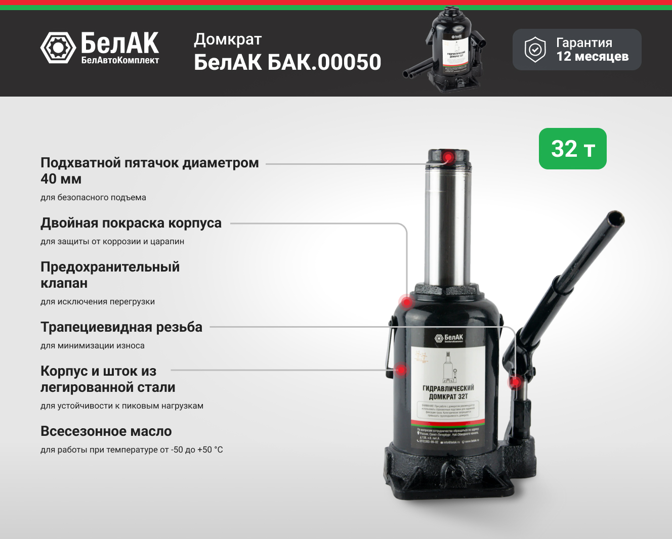 Домкрат БелАК 32 т БАК.00050 разработан российским производителем «БелАК», награждённым двумя национальными премиями «Автокомпонент года» и «Автоаксессуар года» за высокое качество и надежность выпускаемых домкратов. Продукция «БелАК» соответствуют нормам сертификации ISO9001 и ЕАС.