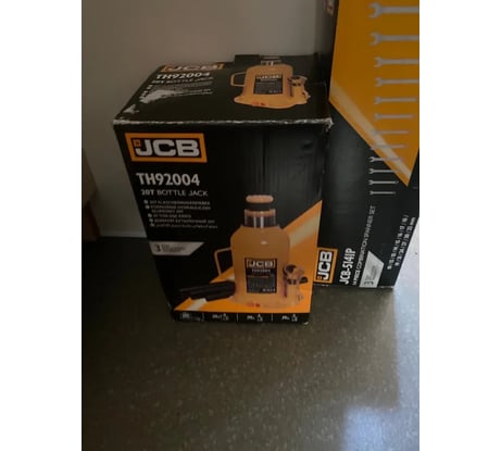 Бутылочный гидравлический домкрат от бренда JCB с грузоподъемностью до 5 тонн. Мощное и надежное средство для поднятия и удержания автомобилей.