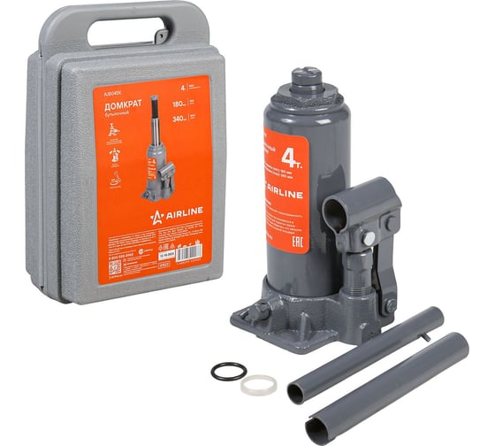 Домкрат бутылочный 4т 180-340мм, кейс AIRLINE AJB04SK Бутылочные домкраты обладают самыми компактными размерами и простейшей схемой функционирования. Занимает мало места и не требует особых знаний в использовании. Единственное требование – хранение и транспортировка в вертикальном положении. Бутылочные домкраты имеют самый широкий модельный ряд (от 2 до 200т), что делает их незаменимыми при необходимости поднять грузовик или автобус.