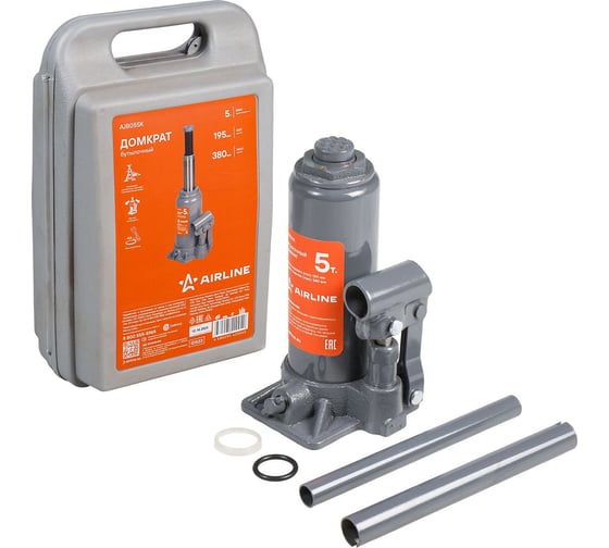 Домкрат бутылочный 5т 195-380мм, кейс AIRLINE AJB05SK Бутылочные домкраты обладают самыми компактными размерами и простейшей схемой функционирования. Занимает мало места и не требует особых знаний в использовании. Единственное требование – хранение и транспортировка в вертикальном положении. Бутылочные домкраты имеют самый широкий модельный ряд (от 2 до 200т), что делает их незаменимыми при необходимости поднять грузовик или автобус.