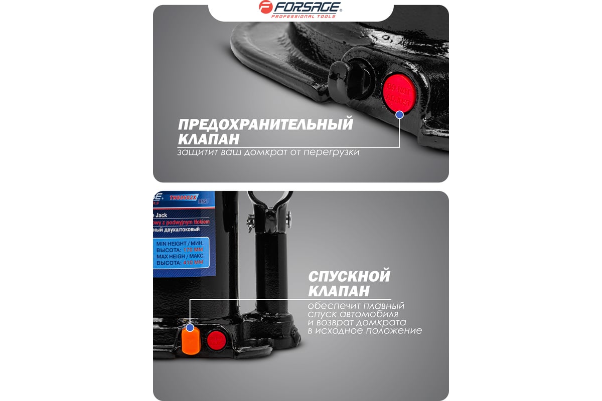 Домкрат бутылочный автомобильный двухштоковый от бренда Forsage с грузоподьемностью до 6 тонн , является высококачественным оборудованием, которое предназначено для подъема автомобилей в автосервисах, шиномонтажных центрах для работ по ремонту и техническому обслуживанию.