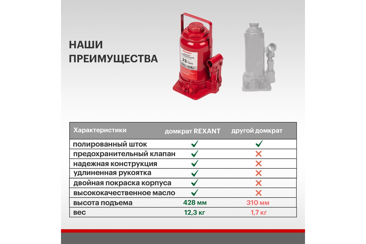Гидравлический бутылочный домкрат поднимает грузы массой до 25 тонн на высоту до 428 мм. Оптимален для автомобилей с большим клиренсом. Будет полезен автолюбителям при проведении технического обслуживания и ремонта, а также для профессионалов на СТО.