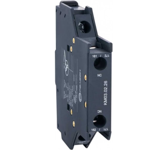 Контактный блок KM03.02.26 предназначен для бокового монтажа на контакторы серии KM3. Устройство оснащено двумя нормально замкнутыми (2НЗ) контактами с номинальной нагрузкой 10А, что обеспечивает надежную работу в цепях управления и защиты. Блок отличается удобной конструкцией для быстрой установки без изменения габаритов основного контактора.