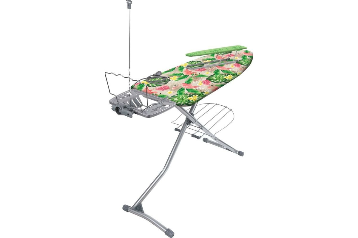В подставке есть крепления для подвешивания одежды на плечиках, а внизу под рабочей поверхностью - полочка для белья. Прилагается съемный подрукавник. Гладильная доска легко складывается и не занимает много места в сложенном состоянии.